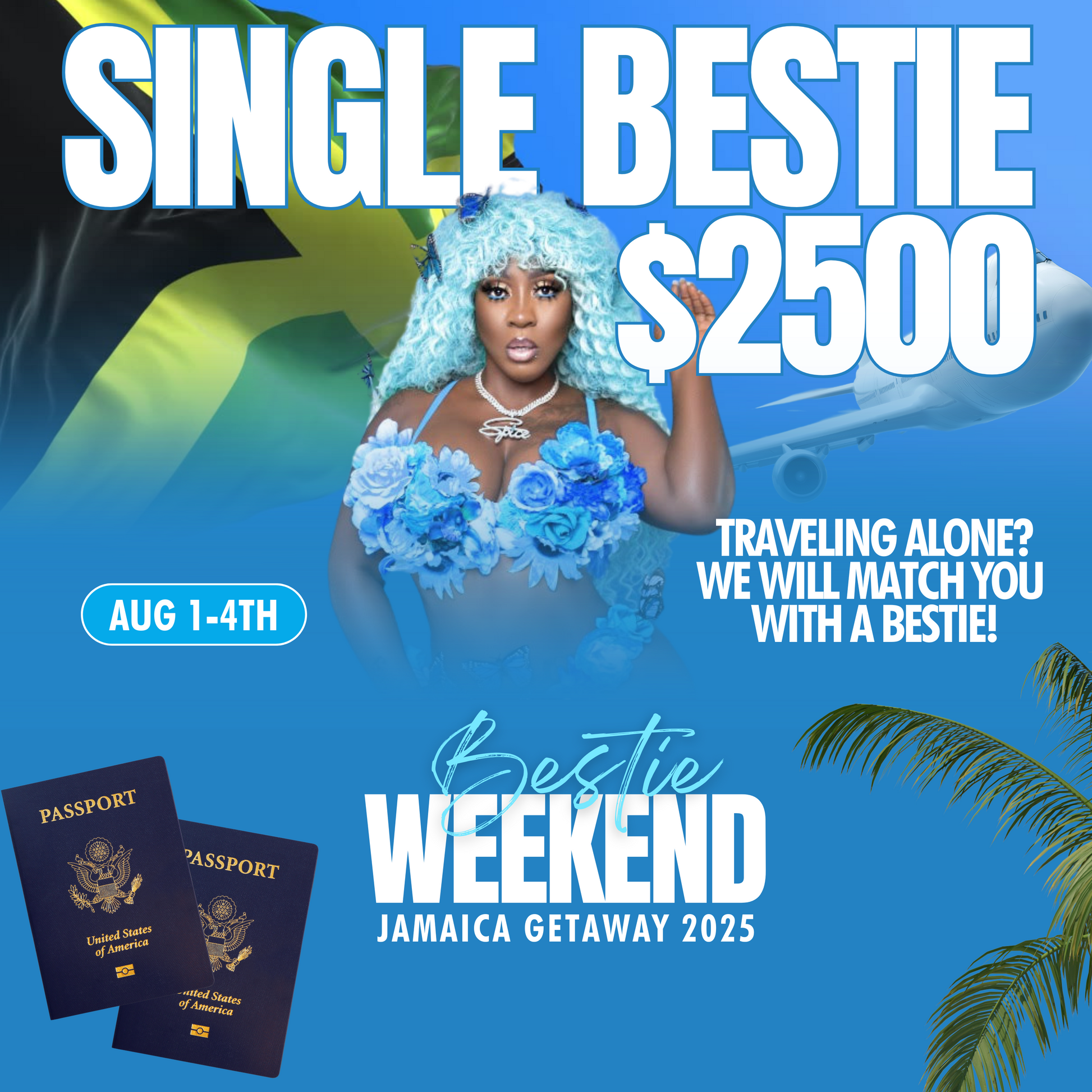 Event Bestie Weekend Jamaica Getaway Dates: August 1–4, 2025 Get ready for an unforgettable three-night escape filled with fun, adventure, and a dash of spice! Package Details:Cost: $2,500 per person. Each room sleeps two besties. Total cost: $5,000 per room. Inclusions: 3 nights at an all-inclusive hotel Ground transportation. Excursions and exclusive events listed in the package Important Information: Airfare is not included. A total payment of $5,000 per room is required for full confirmation.The trip must be fully booked and paid for by March 2025.Cancellation Policy: No refunds after March 30, 2025.Don’t miss this perfect chance to create lifelong memories with your bestie!